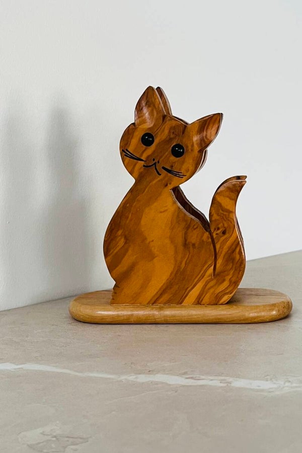 Porte-serviettes artisanal en bois en forme de chat. Il peut également accueillir des lettres, des cartes, etc.