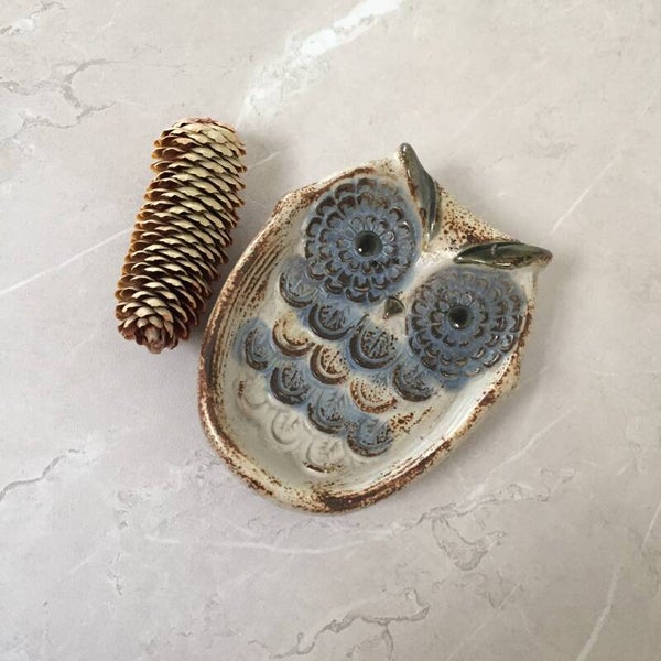 En céramique joliment travaillée avec du relief. Il peut accueillir vos petits trésors !