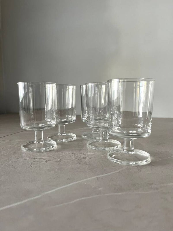 5 verres à pied des années 70, avec un design d'antan et une simplicité qui leur permet de s'intégrer facilement à nos tables d'aujourd'hui.