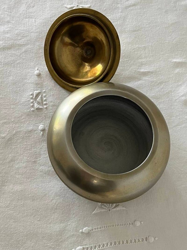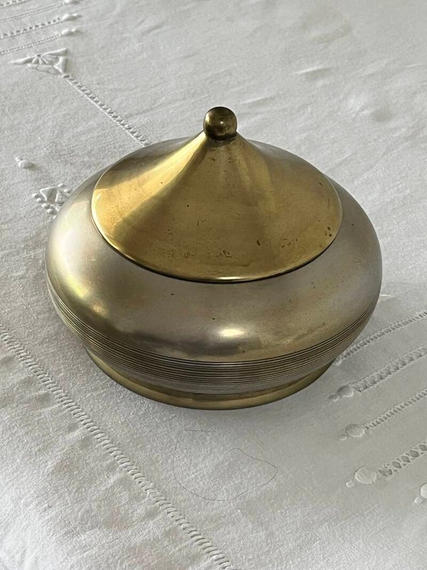 Cette bonbonnière pyramidale en métal est un véritable bijou. Son design unique combine des formes rondes et sculpturales, rehaussé par deux tons de dorés qui scintillent à la lumière.