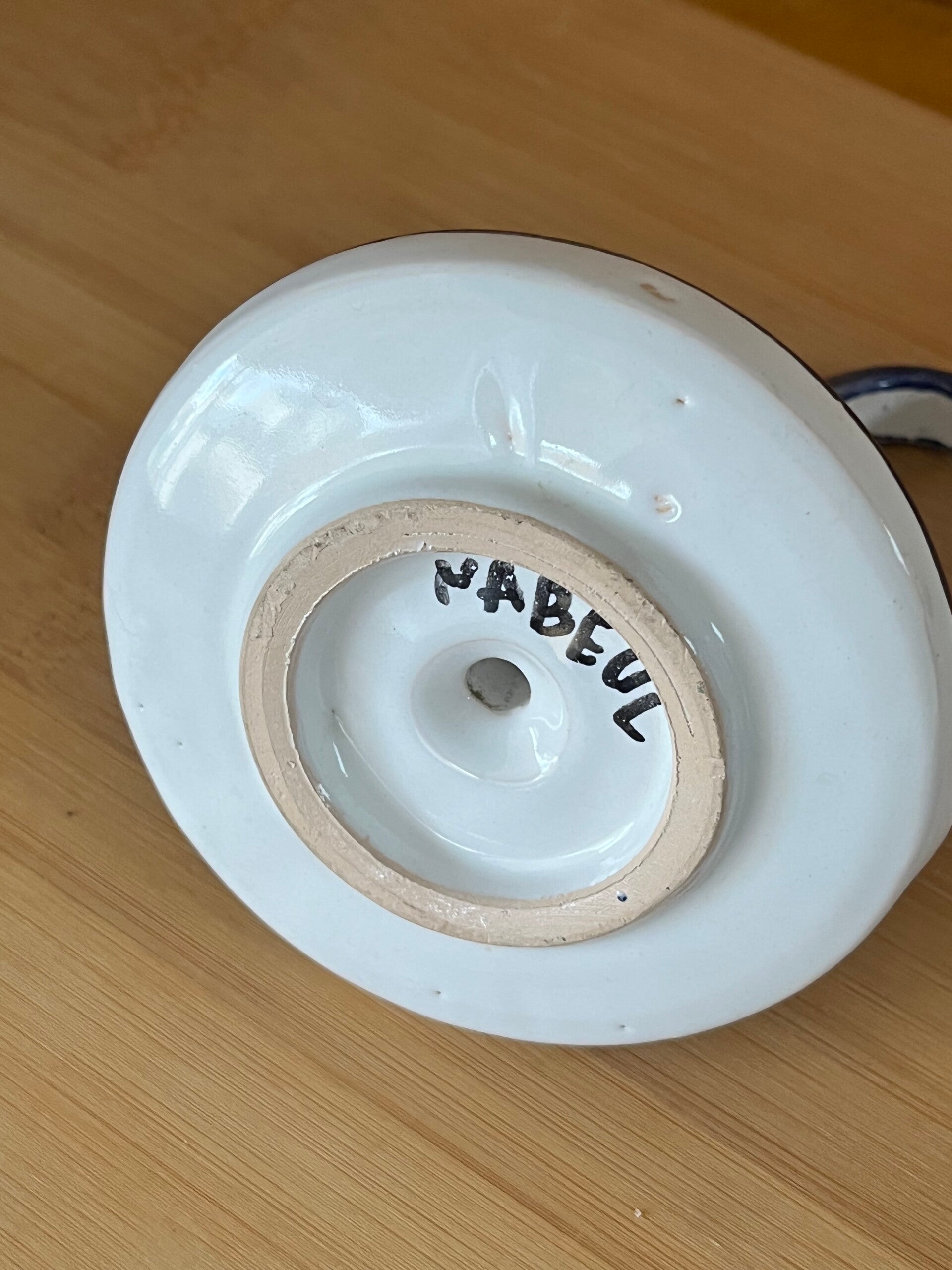 Bougeoir à main en poterie de Nabeul en Tunisie. Très original avec son anse décalée.