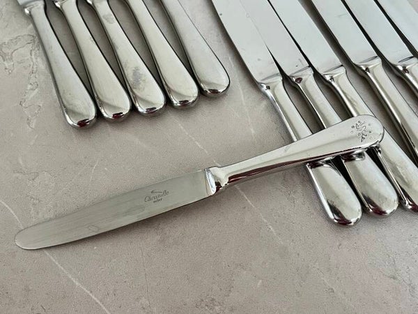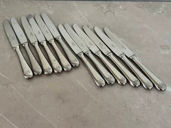 12 couteaux à entremet Christofle en métal argenté. Les manches sont "sculptés"