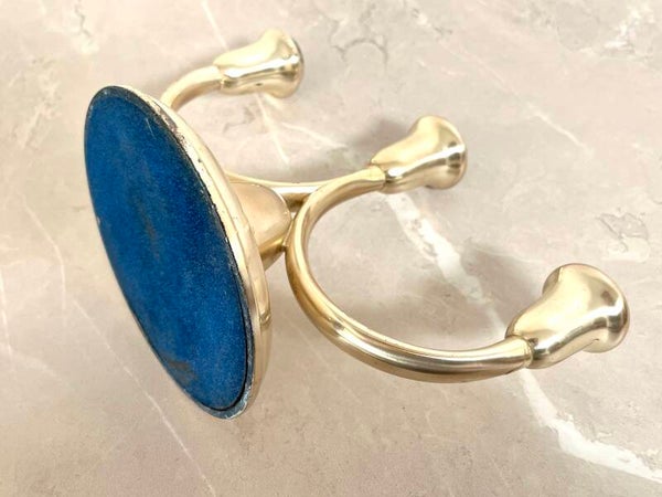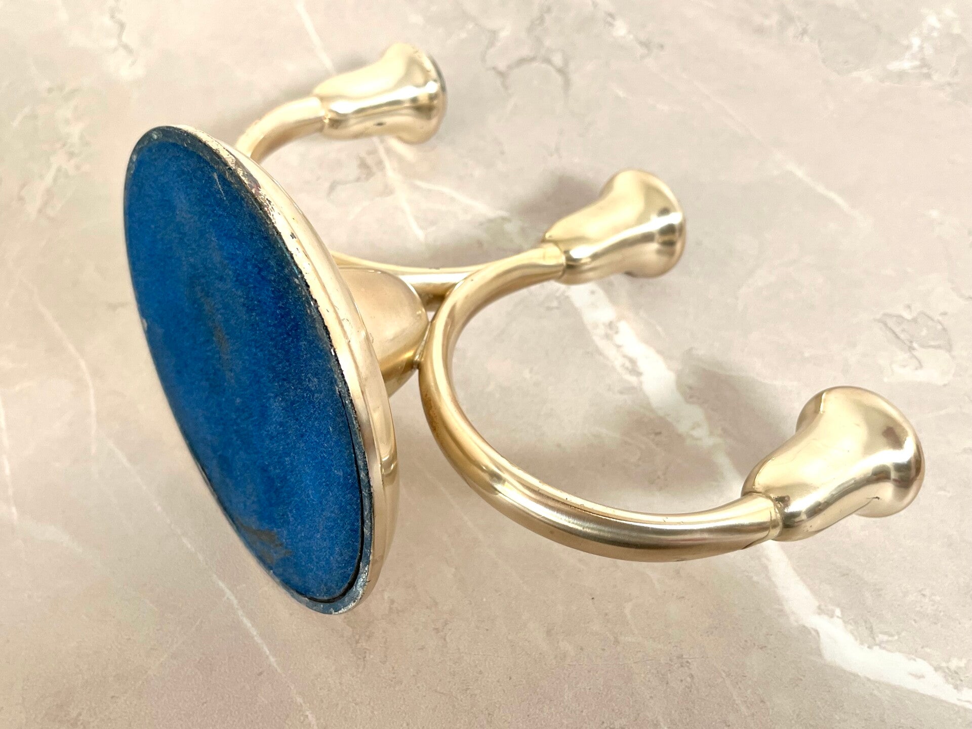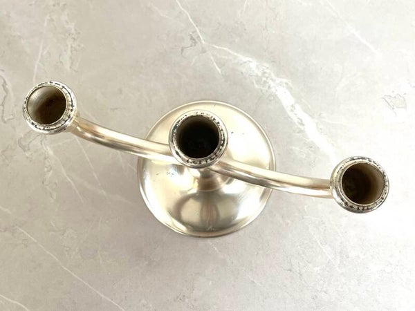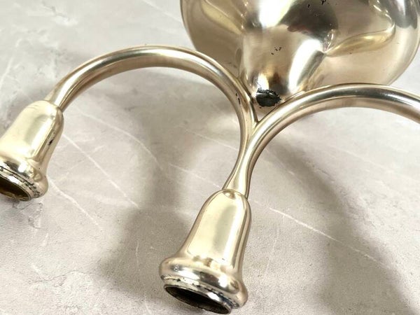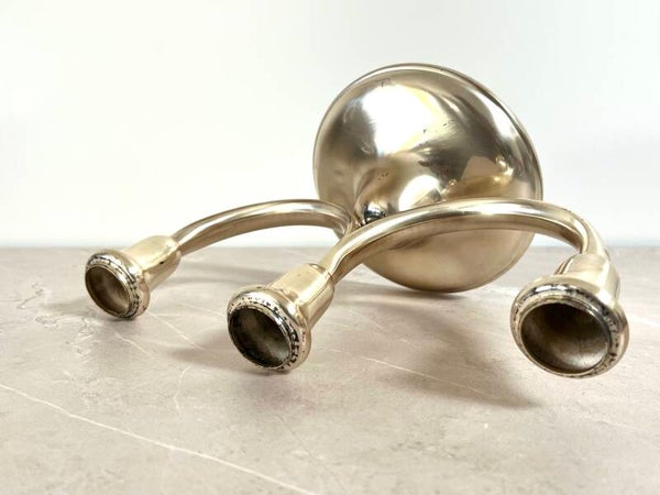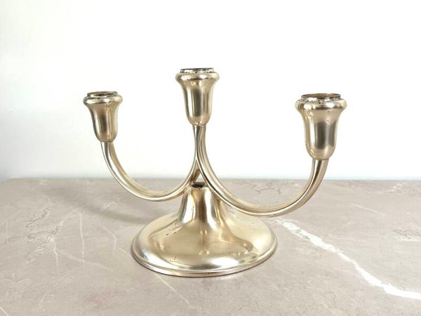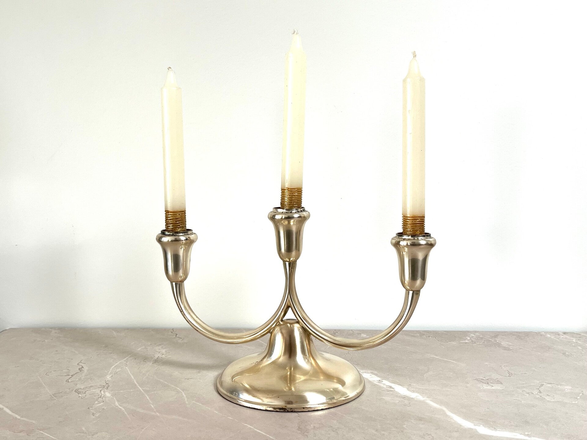 Candélabre porte-bougies 3 branches en métal lourd, légèrement doré et en bon état avec un feutre sous le dessous pour une stabilité optimale. Les bougies standard lui sont adaptées.