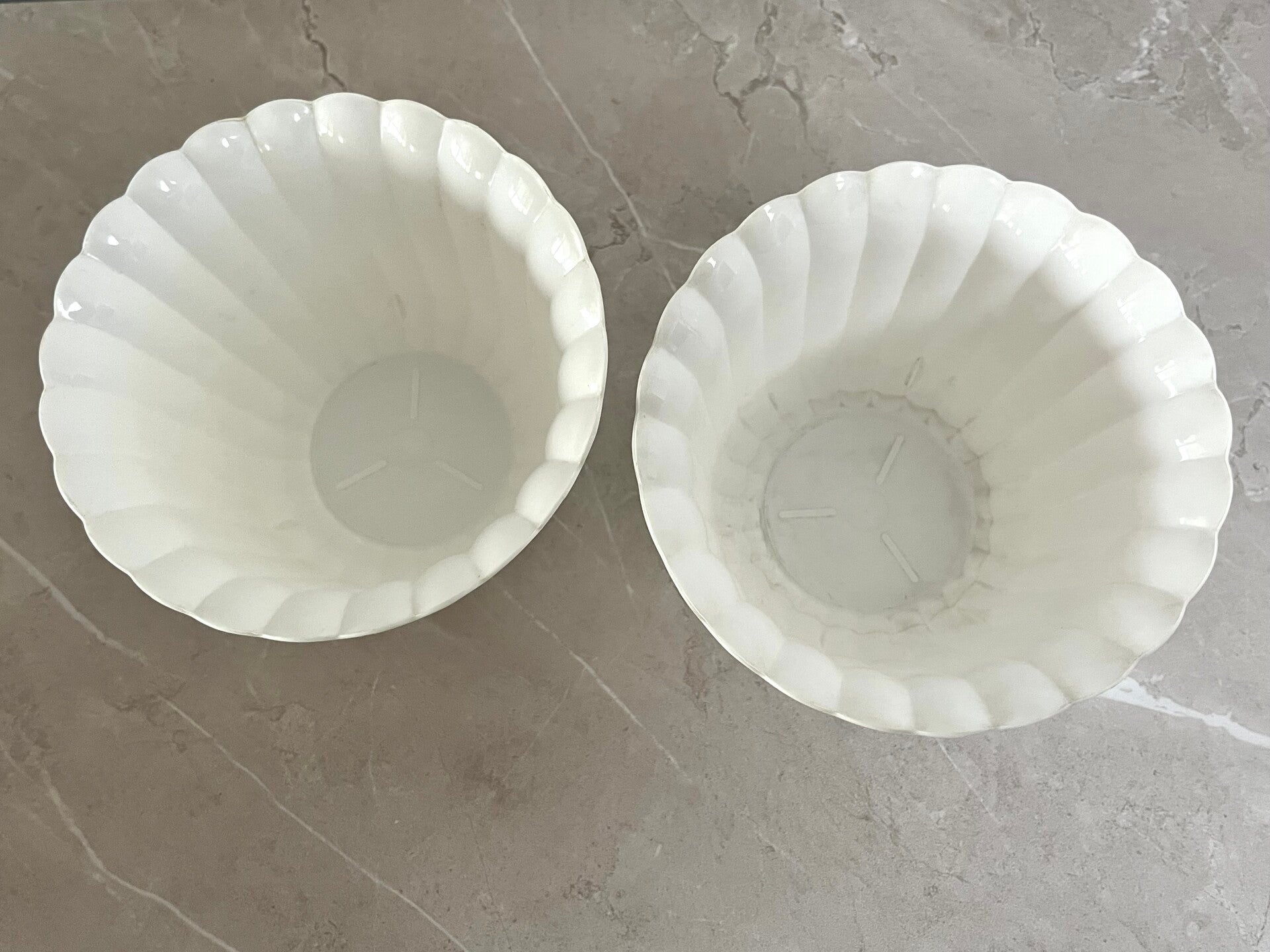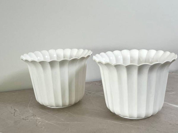 2 cache-pot blancs des années 70 marqués Emsa et ils sont en parfait état. En plastique dur avec leurs bords en corolle, ils accueillent des petits pots à planter. Un design très actuel à intégrer dans nos intérieurs.