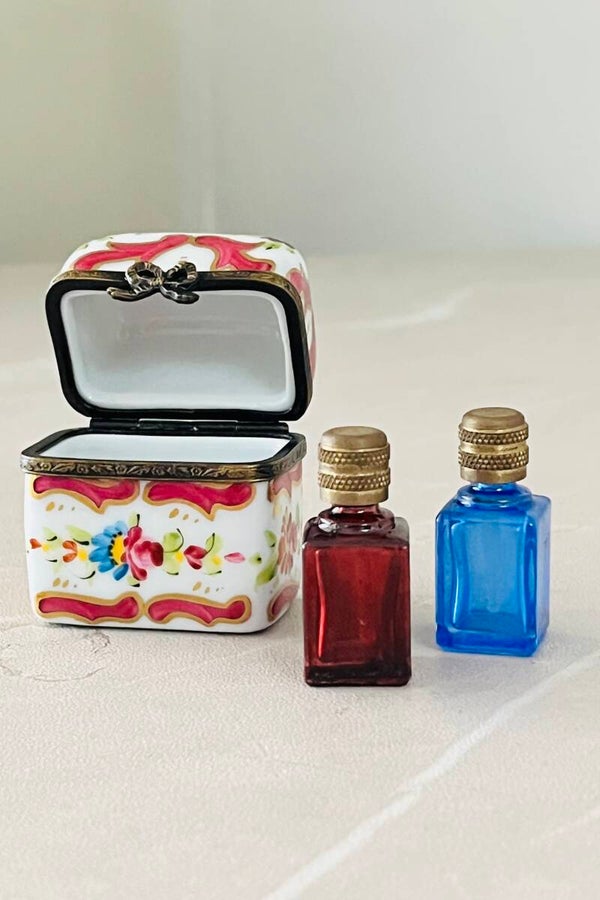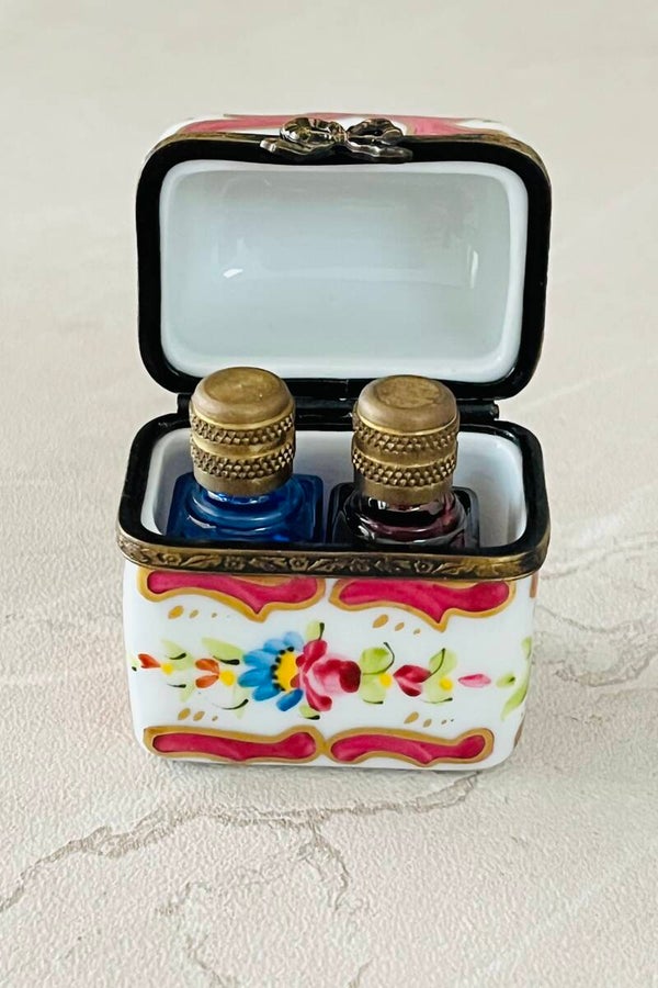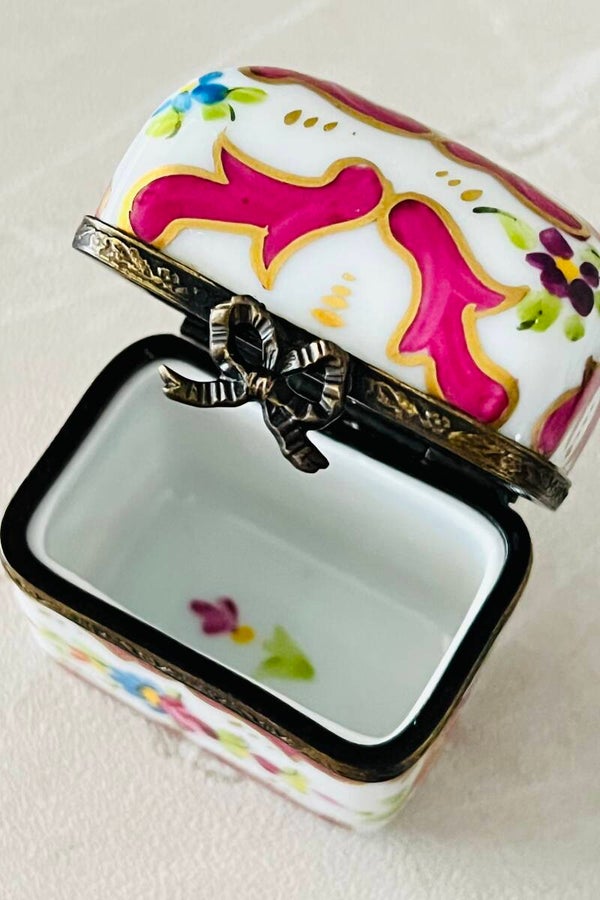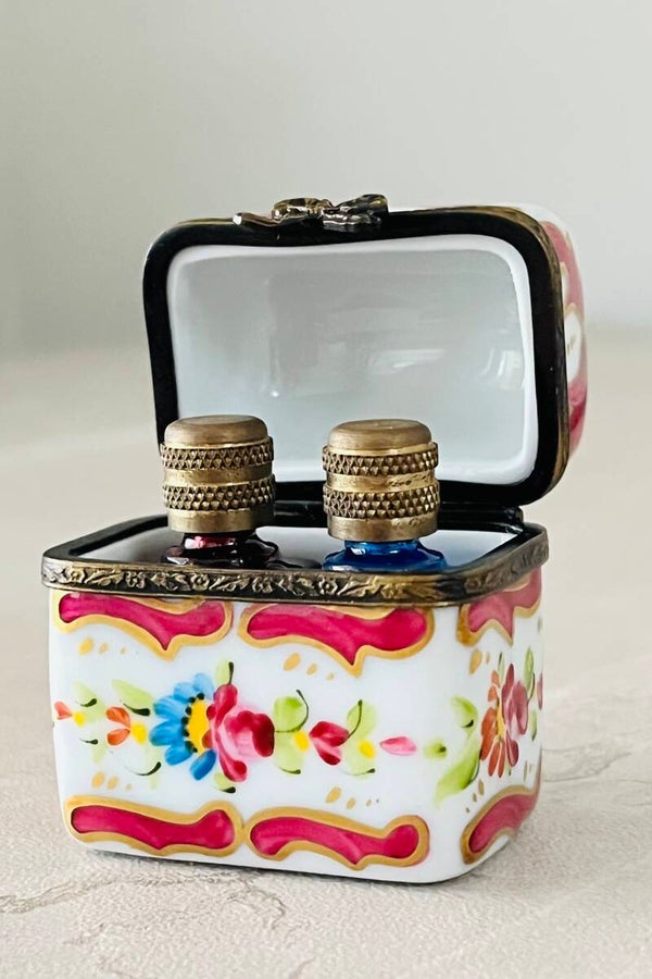 Élégante boîte à parfum en porcelaine de Limoges, peinte à la main avec des motifs délicats. Un objet de luxe à exposer.