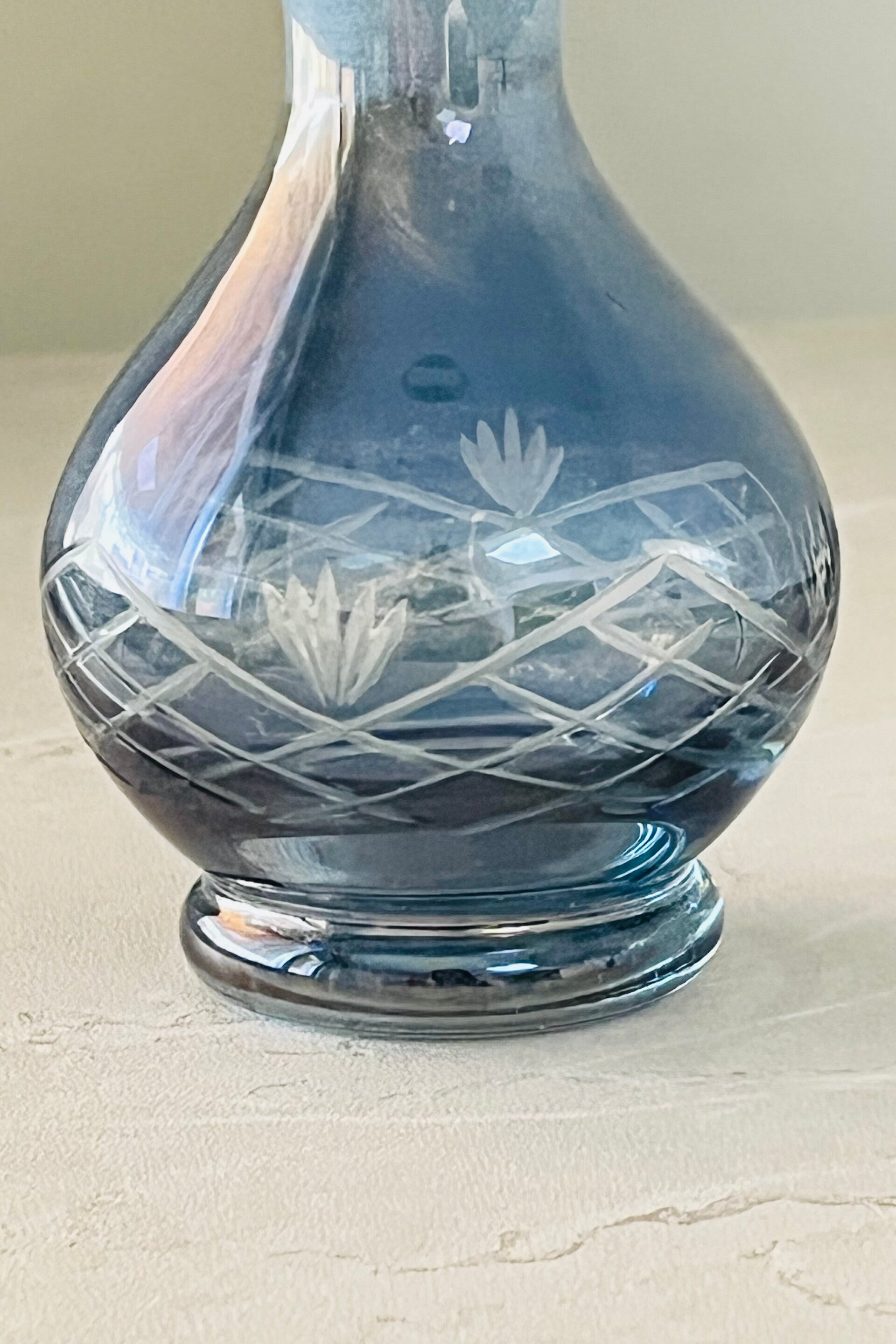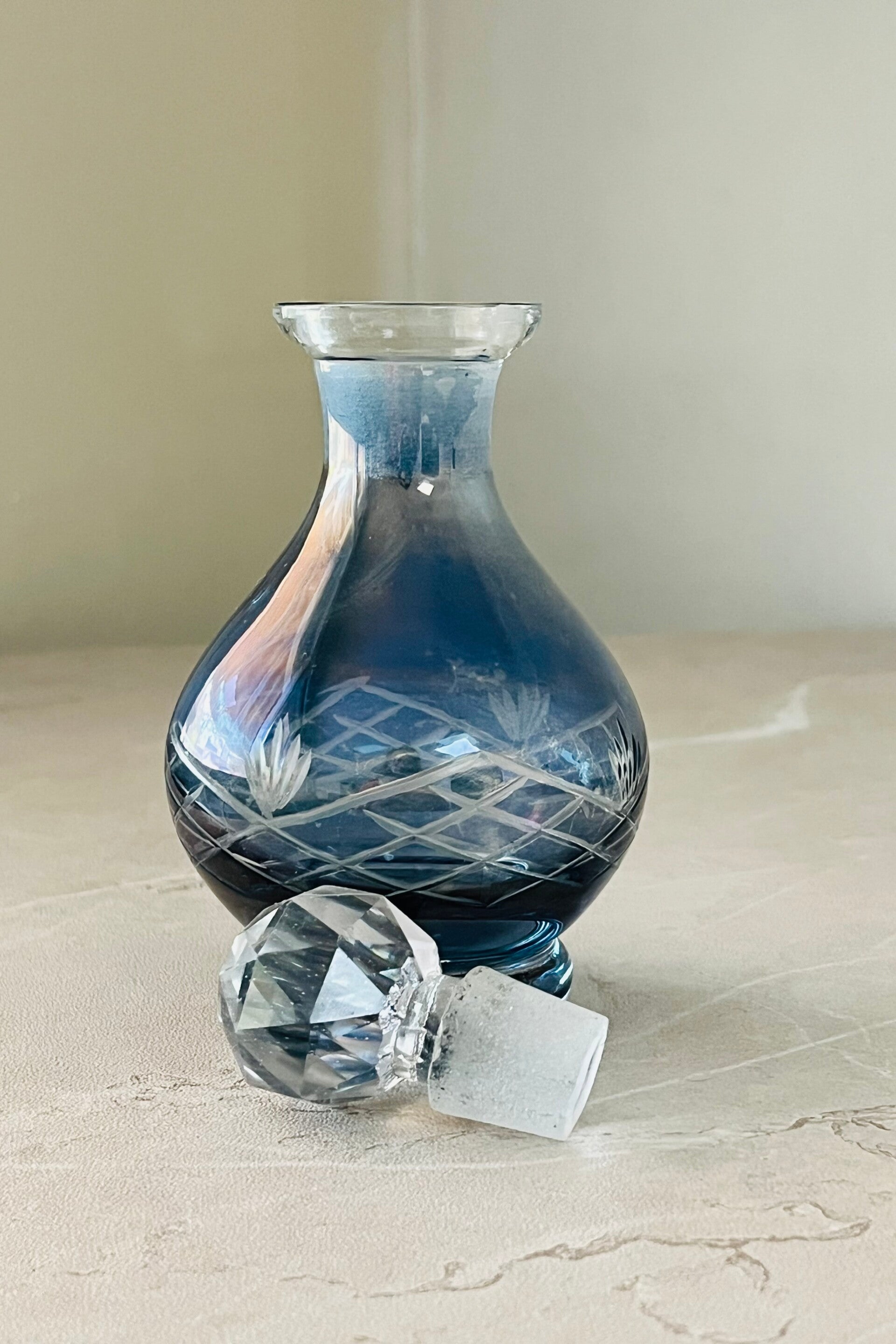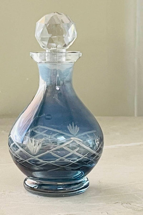 Petit flacon ou fiole à parfum en verre bleu délicatement gravé et en parfait état.