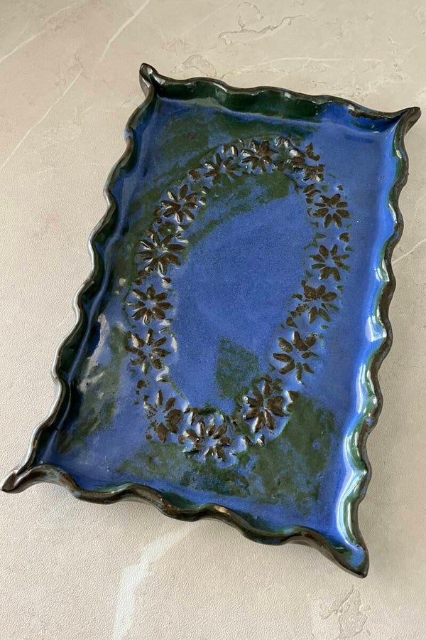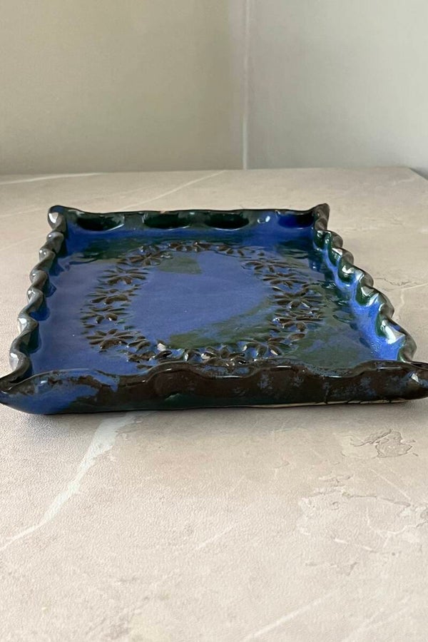 Un plateau pour servir des petits canapés ou poser des verrines, un vide-poche ou tout autre usage lui conviendrait. De couleur bleu nuit, il est délicatement pincé sur son pourtour et arbore une couronne de petites fleurs ou étoiles.