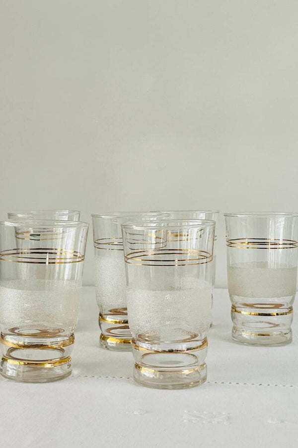 6 verres à eau des années 50 avec effet granité et liseret doré. Remarquez que 2 ont une bande granité légèrement moins large que les 4 autres.
