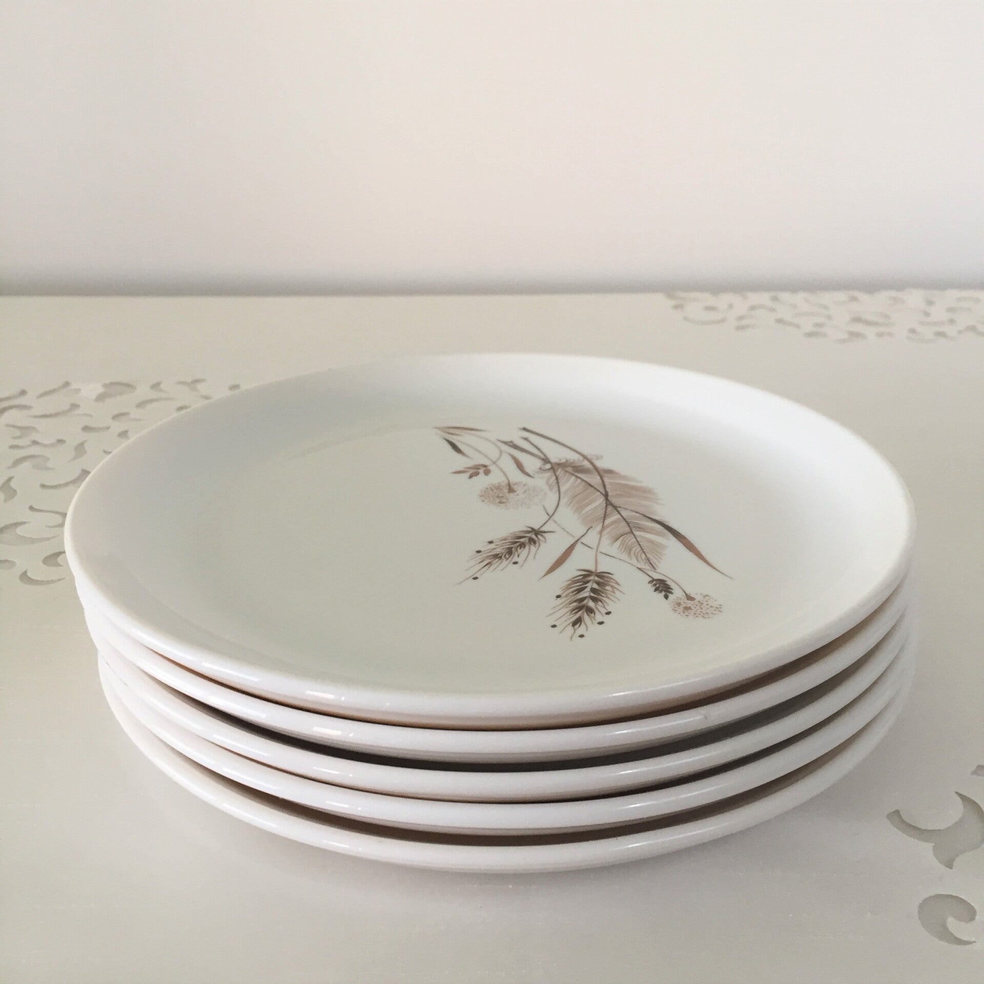 5 jolies assiettes vintage France en opale des Années 60 de la marque Sovirel. Les motifs représentent des épis.
